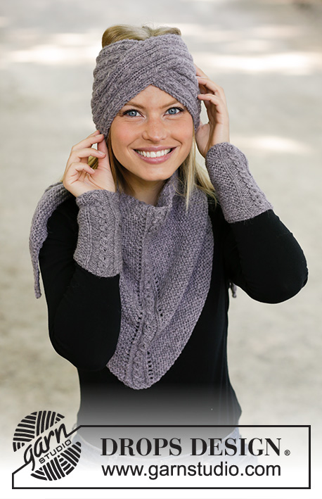 Knitted headband, shawl and pullover in DROPS Sky . The work is knit back and forth with twists and garter sts.