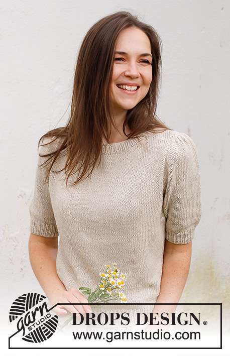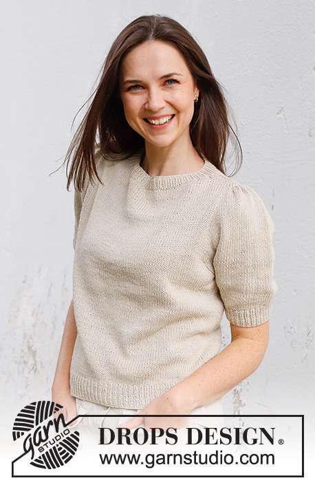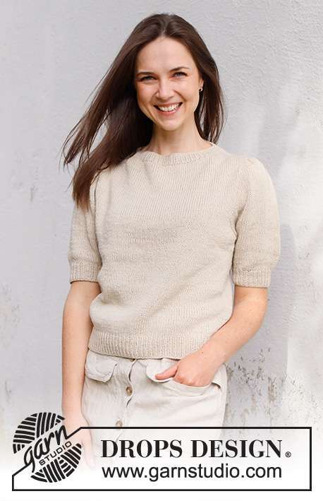 Knitted jumper with short sleeves / t-shirt in DROPS Belle. Piece is knitted top down with shoulder increase, stocking stitch and short puffed sleeves. Size: S - XXXL