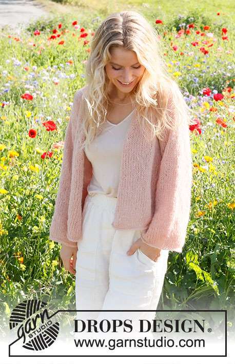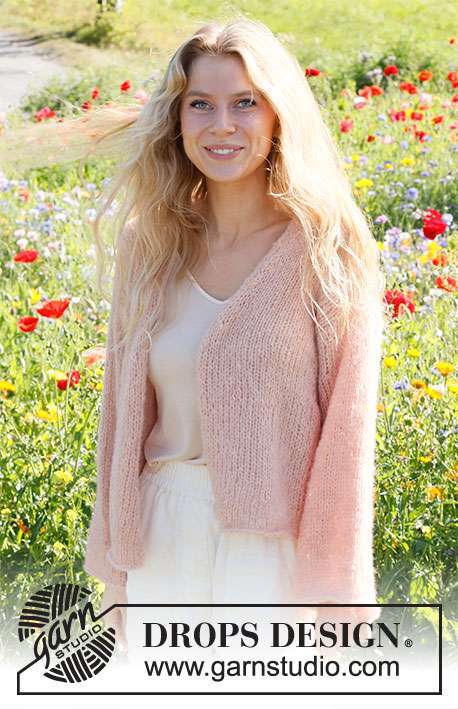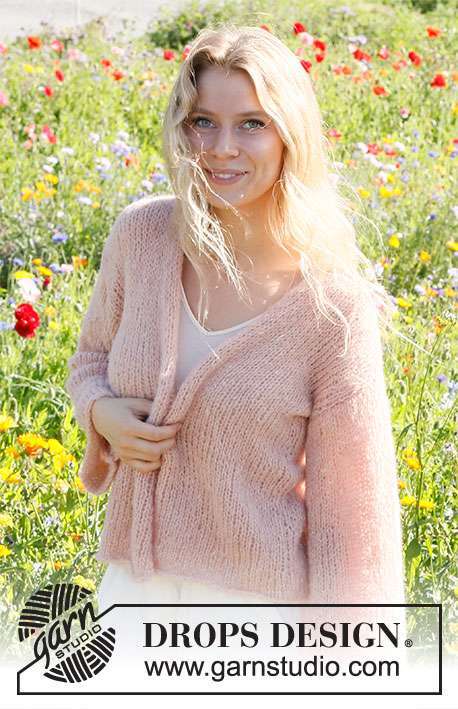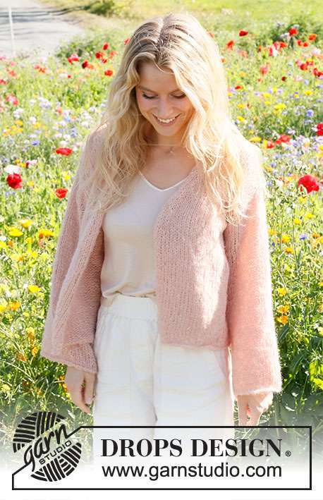 Knitted basic jacket in 2 strands DROPS Brushed Alpaca Silk. Piece is knitted bottom up in stocking stitch. Size XS – XXL.