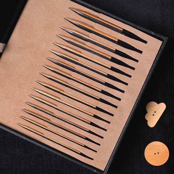 The set contains 8 pairs of interchangeable sticks in different sizes in a combined black and natural colour