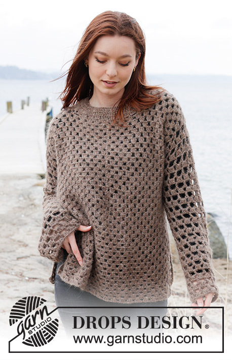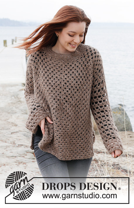 Crocheted sweater in DROPS Brushed Alpaca Silk and DROPS Flora. The piece is worked from the middle outwards, in squares. Sizes S - XXXL.