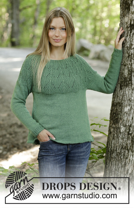 Strikket bluse med rundt bærestykke i DROPS Nord. Arbejdet er strikket med hulmønster og strukturmønster. Størrelse S – XXXL.