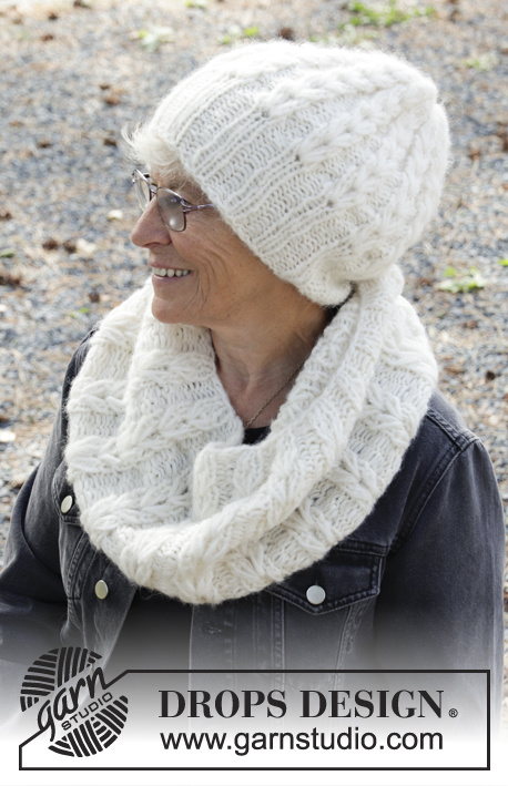 Strikket hue i DROPS Air og DROPS Brushed Alpaca Silk. Arbejdet er strikket rundt med struktur. Strikket hals i DROPS Air og DROPS Brushed Alpaca Silk. Arbejdet er strikket rundt med struktur.