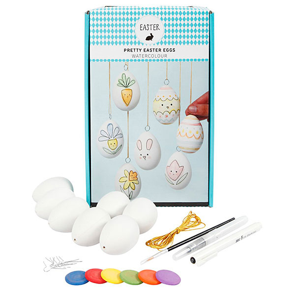 Consists of: 7 plastic eggs, 6 different water colors, 1 brush, 1 marker, 1 water brush suspension and cord.