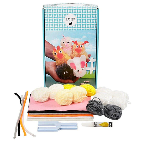A set for decorating 5 Easter eggs of pompoms in acrylic yarn with chenille, felt and Silk Clay.