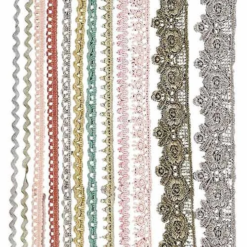 This 12-piece set comes with different styles of lace ribbon, both simple and intricately designed, including variants with metallic thread, in a range of delicate pastel colours. The lace appliques measure between 10-25 mm in width and can be sewn onto tops, special dresses, undergarments, accessories, and more. Each type of lace is unique and comes in a 3-meter long roll, making it a great addition to the accessory kit of any professional tailor or sewing/knitting enthusiast.