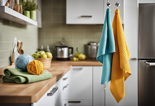 - Yarn selection is key, with a preference for cotton or absorbent blends that withstand kitchen use.