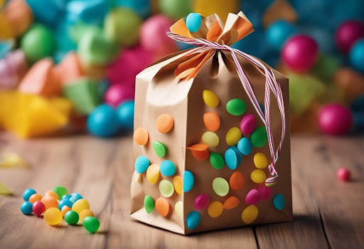 • Open the paper bag and fill it with sweets, confetti, and small toys.