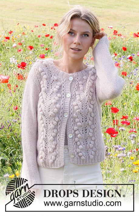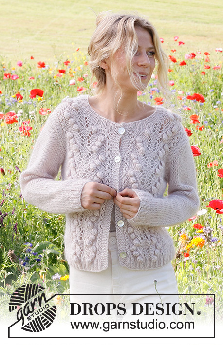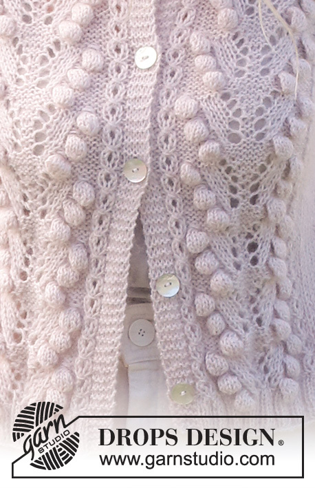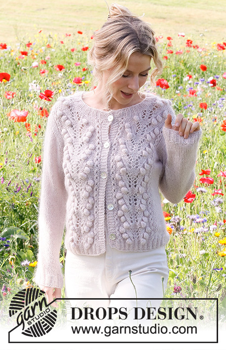 Knitted jacket in DROPS Flora and DROPS Kid-Silk. The piece is worked with lace pattern and bobbles. Sizes S - XXXL.