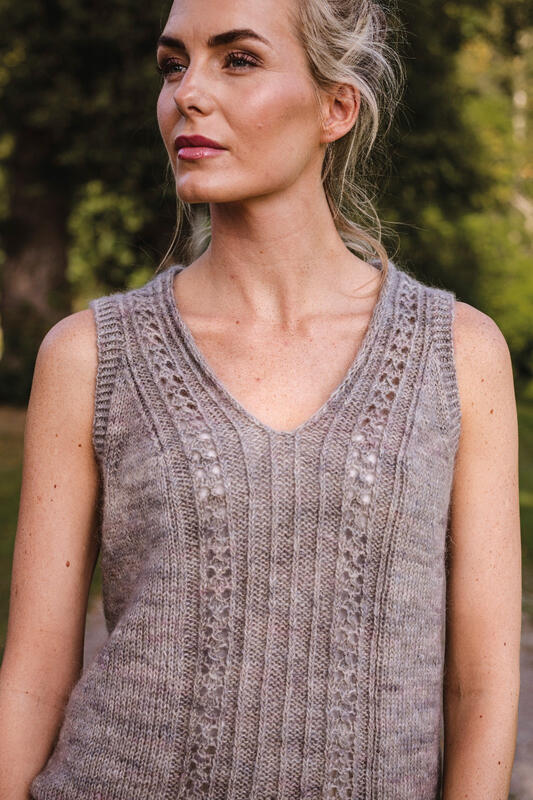 Lace and rib stripes, like gravel paths, run up this vest and then split to frame the V-neck before going over the shoulders to meet and rejoin at center back neck. The vest is worked from the bottom up. Junior Raggi (a sock yarn) and Cabrito (a lovely hand-dyed mohair yarn), are held together throughout. The two yarns combine beautifully to enhance the knitting with a unique look.