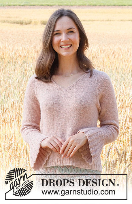 Knitted jumper in DROPS Sky. The piece is worked with V-neck, cables and trumpet sleeves. Sizes S - XXXL.