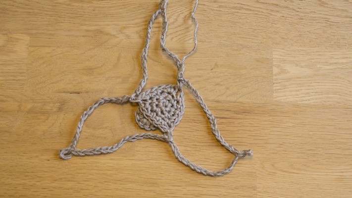 Pull the ring on one of the ropes through one of the rings on the bottom. Pull the rope through its own ring and tighten it. Do this with all three ropes and make sure they are equal in length, otherwise pull up a few stitches until the bottom hangs straight when the plant suspension is hero up.