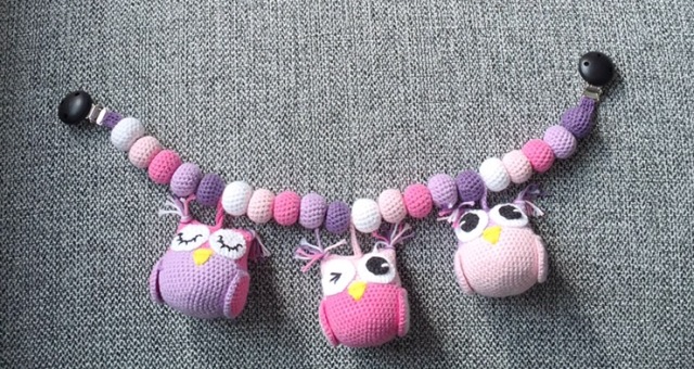 Crocheted stroller chain: Easy to read and detailed crochet pattern on a stroller chain with owls.