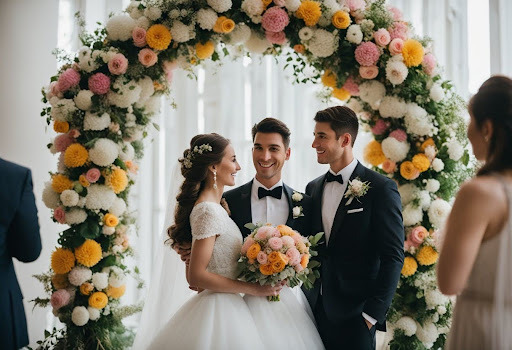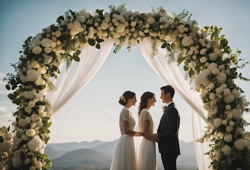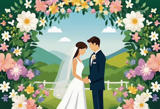- Details: Confetti or hearts surrounding the couple